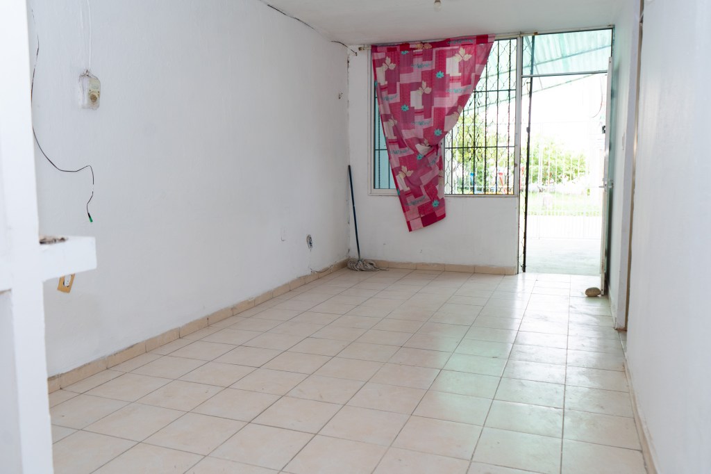 Cocina: Losa de concreto forrada de azulejo, sin gabinetes, permitiendo una personalización según las necesidades del propietario.