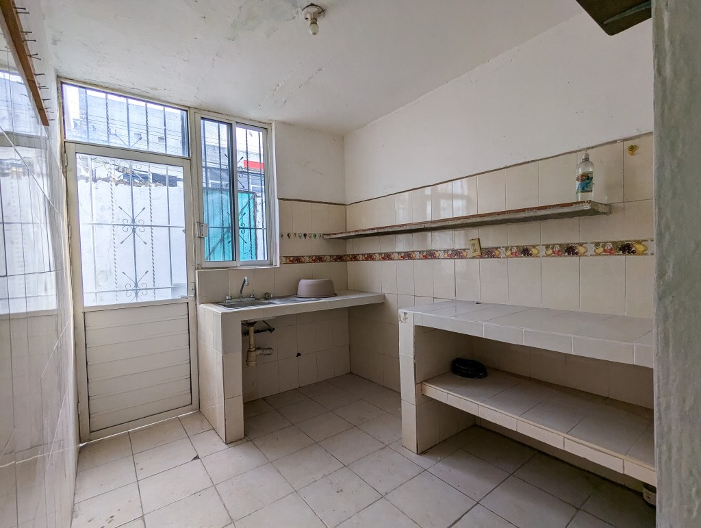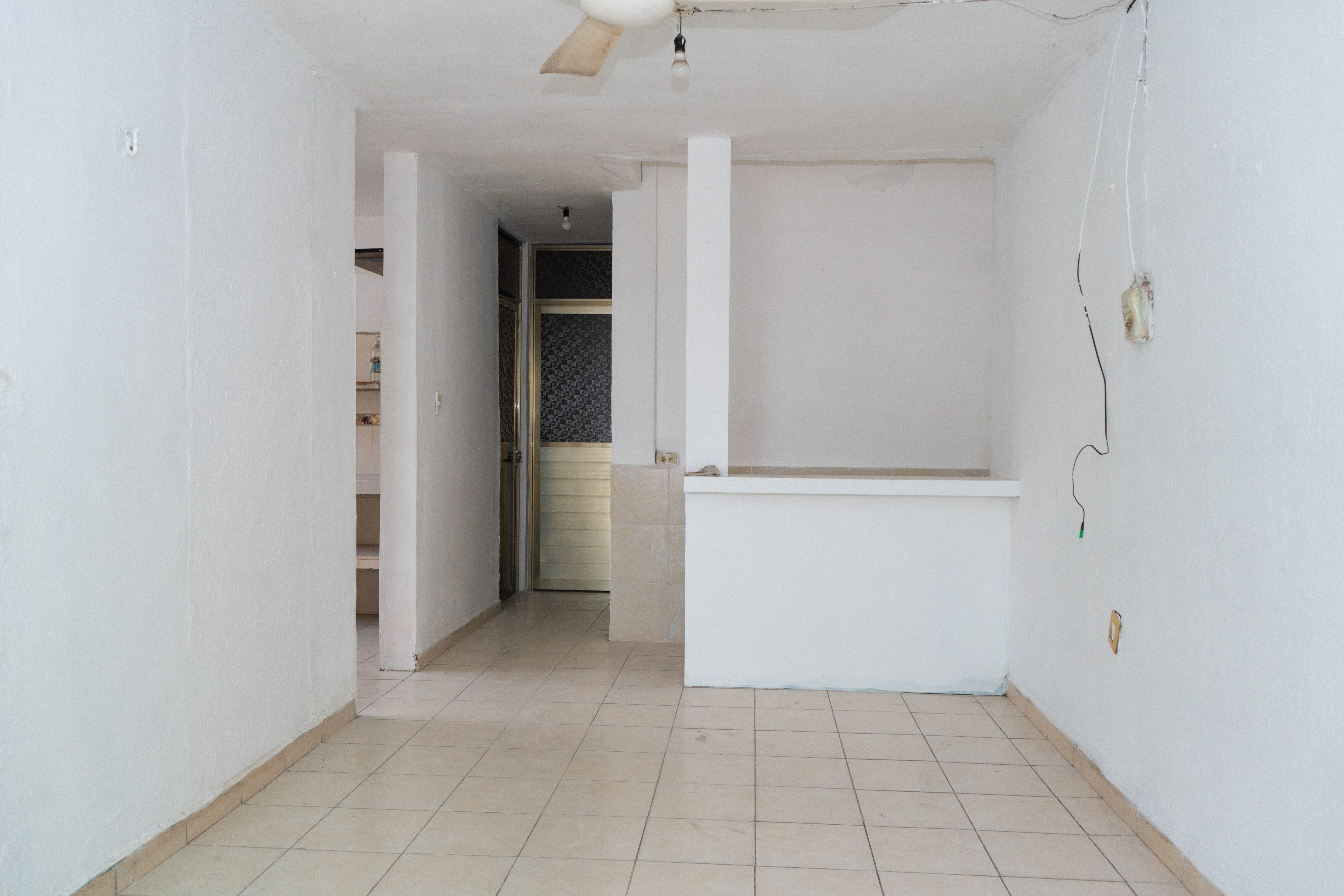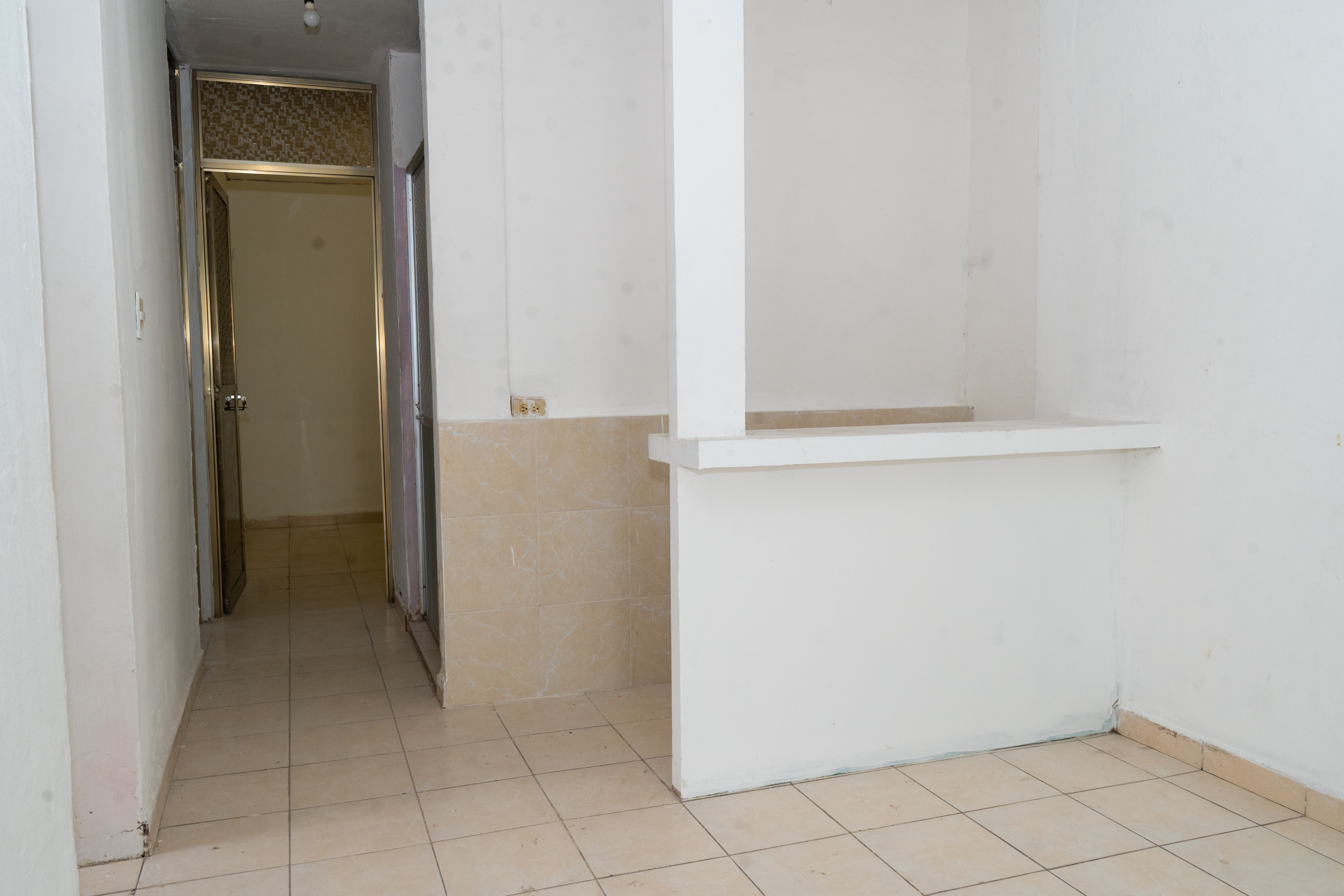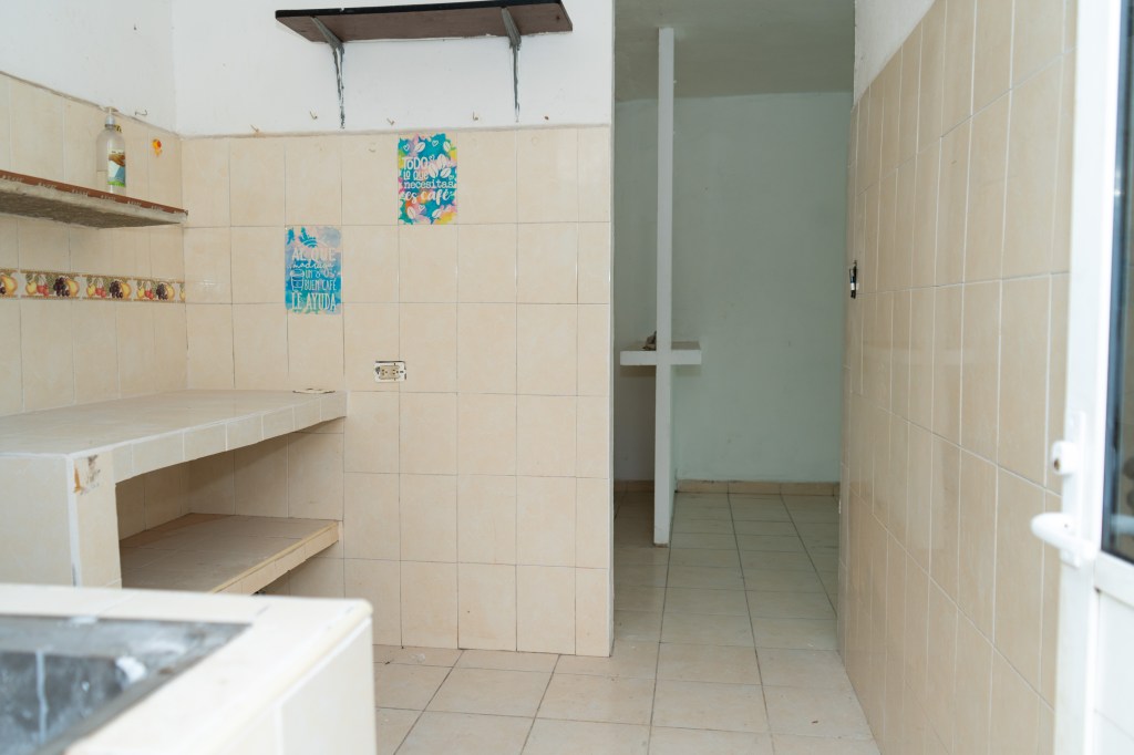 Cocina: Losa de concreto forrada de azulejo, sin gabinetes, permitiendo una personalización según las necesidades del propietario.